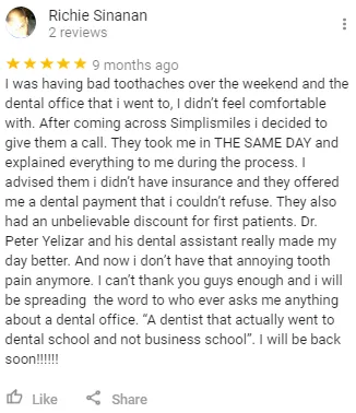 SimpliSmiles has been proudly serving the Hicksville community for the past 8 years. Over that time, we've built a reputation of trust, transparency, and superior treatment in the area. Our Google reviews have surpassed triple digits with a whopping 250+ reviews and a 5.0 star rating. Don't take our word for it, just read what patients have to say about us below!